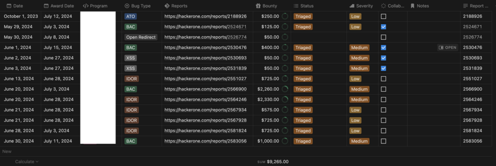 This Notion template is designed to help you organize and analyze your bug bounty data and statistics from Hackerone. With this template, you can easily track your reports, calculate monthly income, and manage other important details.